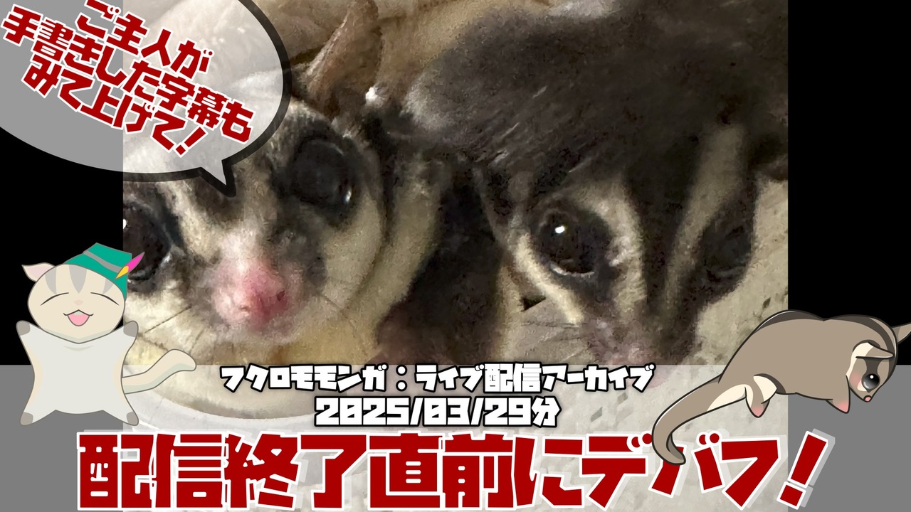 ニコニコ動画の方では字幕を動画に載せました 焼き付ける形で いろんな技術を日々学ぶ感じです 【 #フクロモモンガ 】【 #朝活 】まさか配信終了直前に配信が!【2025/03/29】【作業用】【睡眠用】【 #ペット動画 】【 #おつモモンガ 】 https://t.co/2YzRqyXMvJ #sm44908717 #ニコニコ動画 https://t.co/uTDNMn4cg0